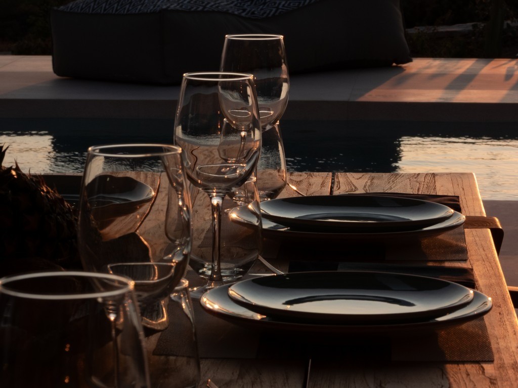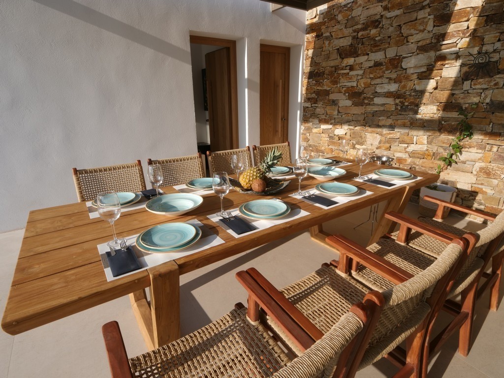 The outdoor spaces are perfectly configured for dining and entertaining. Directly accessible from the villa's main living area is a spacious, shaded outdoor dining area, complete with a traditional built-in barbecue, making it the ideal spot for al fresco lunches and memorable evening dinners under the stars. For a truly captivating experience, ascend to the expansive rooftop terrace. This exclusive vantage point is the ultimate setting for sunset cocktails, offering unobstructed, 360-degree views as the sky transitions from brilliant blue to fiery orange and deep violet—the perfect conclusion to any perfect day at Villa Dilion.