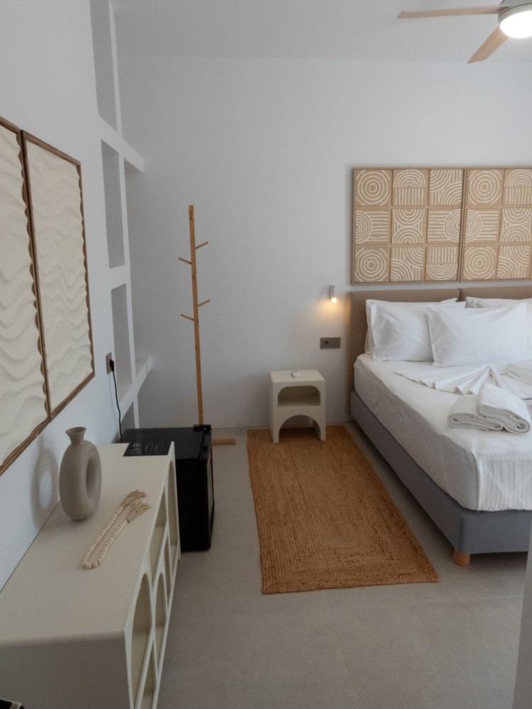 The Artemis Master Bedroom is a calming haven dedicated to peace and natural light, echoing the grace of its namesake. This beautifully appointed suite is perfect for guests seeking a quieter connection to the island's serenity. Equipped with a luxurious queen or king bed, the design employs soft textures, earth tones, and clean lines typical of sophisticated Cycladic minimalism. The focus here is on creating a restful, private space where the beauty of Antiparos is filtered gently indoors, ensuring a deep and restorative night's sleep.